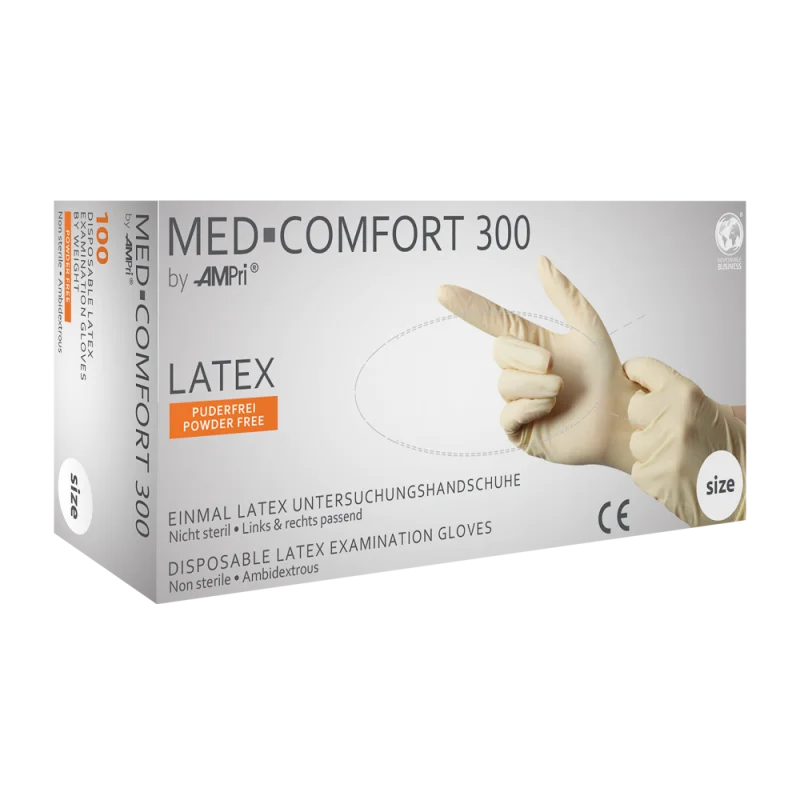 AMPRI-Hygiene, Einweg-Latex-Einmal-Untersuchungs-Handschuhe, MED COMFORT 300, puderfrei, weiß, Pkg á 100 Stück, VE = 10 Pkg.