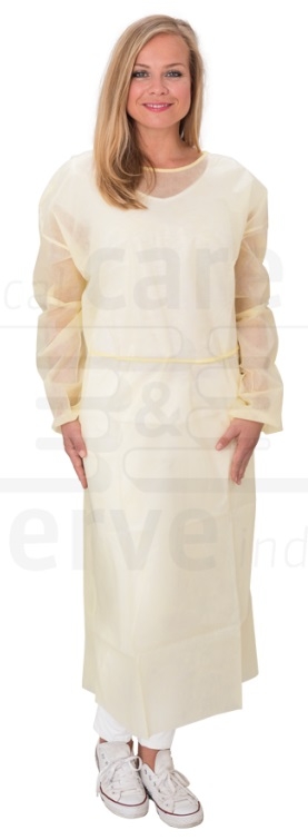 WIROS-care&serve-Hygiene, Einweg-Vlies-Kittel, Einmal-Mantel, Schutzkittel, PE Laminierungan Armen & Frontpartie, Gummizugbündchen, gemäß EN 14126, 140 x 130 cm, Pkg á 10 Stück, VE = 100 Stück, gelb