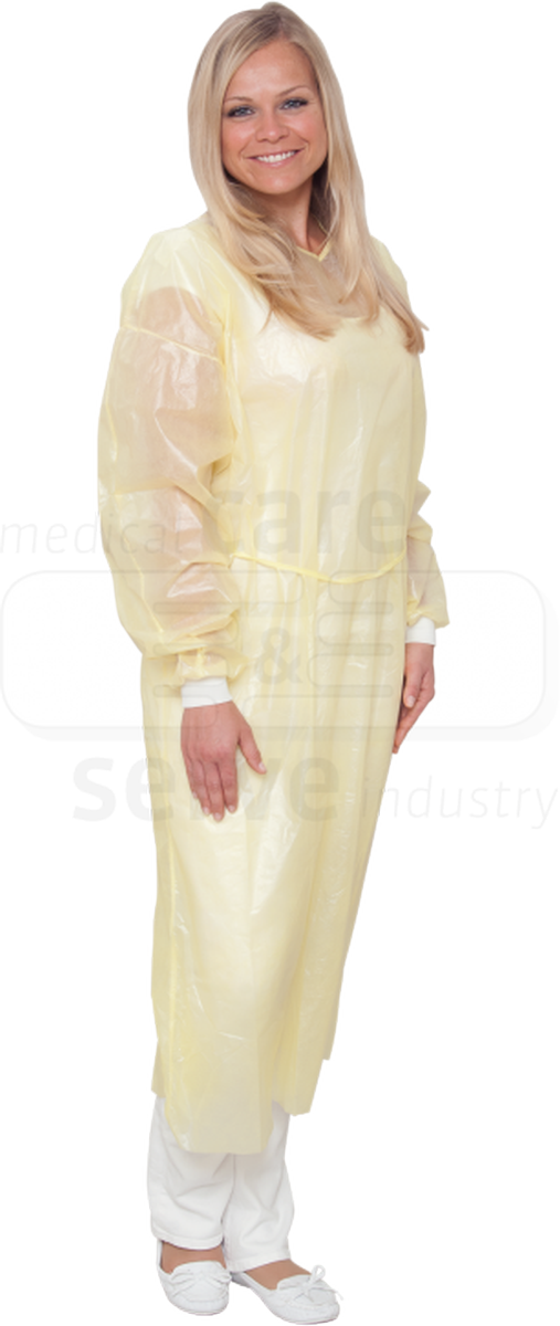 WIROS-care&serve-Hygiene, Einweg-Vlies-Kittel, Einmal-Mantel, Schutzkittel, PE Laminierungan Armen & Frontpartie, Strickbündchen, gemäß EN 14126, 140 x 135 cm, gelb, Pkg á 10 Stück, VE = 100 Stück