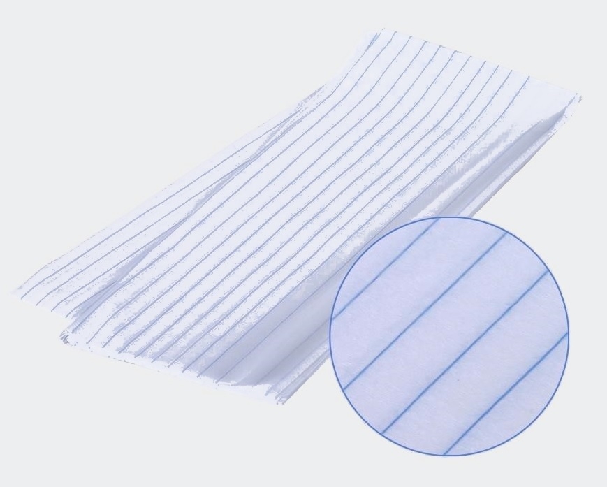 Das Laken besteht aus einer Kombination von Tissue und PE-Material, was es besonders robust und gleichzeitig angenehm weich macht. Die weiße Grundfarbe mit blauen Fäden sorgt für eine klare optische Orientierung und ein professionelles Erscheinungsbild.
