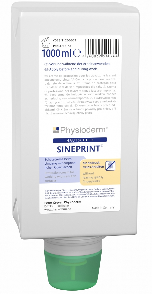 SINEPRINT ist eine innovative Hautschutzcreme, die speziell für den Umgang mit empfindlichen Oberflächen und mechanisch reizenden Arbeitsstoffen entwickelt wurde. Diese hochwertige Creme bildet einen unsichtbaren, atmungsaktiven Schutzfilm auf der Haut, der Fingerabdrücke verhindert und gleichzeitig vor Staub, Metallabrieb, Glasfaserstäuben und Papier schützt.