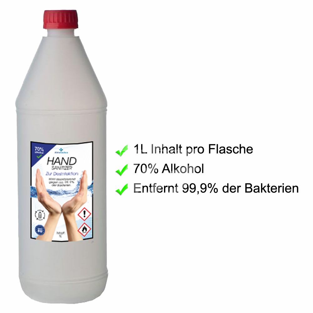 Dieses Handdesinfektionsmittel ist ein effektives Mittel zur Hygiene und Keimbekämpfung in Alltag und Beruf. Es eignet sich ideal für den Einsatz in Haushalten, Büros, medizinischen Einrichtungen oder unterwegs, wo gründliche Handreinigung ohne Wasser erforderlich ist. Die Formel basiert auf einem hohen Alkoholgehalt, der Bakterien, Viren und Pilze zuverlässig abtötet, und sorgt für eine schnelle Desinfektion innerhalb weniger Sekunden.Das Produkt zeichnet sich durch seine hautverträgliche Zusammensetzung aus, die Feuchtigkeitsspender wie Glycerin enthält, um Trockenheit und Reizungen zu vermeiden. Es ist geruchlos oder mit einem neutralen Duft erhältlich, was es für empfindliche Nutzer angenehm macht. Die 1000-ml-Flasche ist praktisch für den Nachfüllgebrauch und reduziert Abfall durch wiederverwendbare Dispenser. Besonders hervorzuheben ist die Wirksamkeit gegen gängige Erreger, einschließlich enveloped Viren wie Influenza oder Coronaviren, was es zu einem zuverlässigen Helfer in Zeiten erhöhter Infektionsrisiken macht.