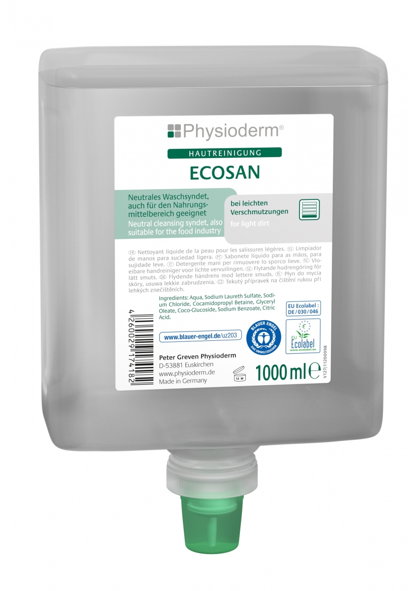 Die parfüm- und farbstofffreie Zusammensetzung macht ECOSAN besonders hautfreundlich und minimiert das Risiko von Allergien oder Hautreizungen. Der hautneutrale pH-Wert und die Abwesenheit von Seifen und Alkalien tragen zusätzlich zum Hautschutz bei. ECOSAN entfernt effektiv leichte Verschmutzungen, ohne die natürliche Schutzbarriere der Haut zu beeinträchtigen.