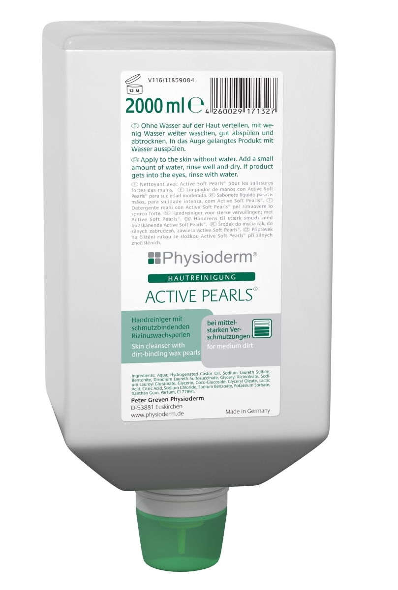 ACTIVE PEARLS® ist ein innovativer Handreiniger für mittelstarke Verschmutzungen im Arbeitsalltag. Mit seinen schmutzbindenden Rizinuswachsperlen entfernt er effektiv Öl, Ruß und Metallstaub, ohne die Haut zu belasten. Die patentierten ACTIVE SOFT PEARLS® (ASP) lösen Schmutzpartikel sanft und hinterlassen keine Rückstände in Abflüssen.