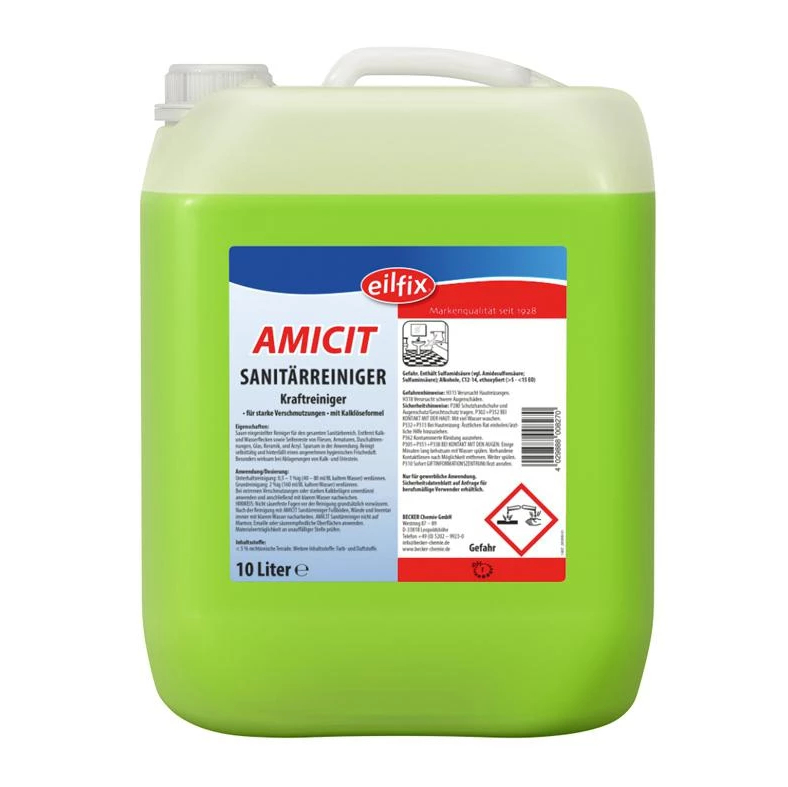 Der Amicit Sanitärreiniger ist ein hochwirksames, saures Reinigungsmittel, das speziell für den Einsatz in sanitären Anlagen entwickelt wurde. Es eignet sich ideal für die tägliche Reinigung von Bädern, Toiletten, Waschbecken und Fliesen in gewerblichen, industriellen oder privaten Bereichen. Das Produkt entfernt zuverlässig Kalkablagerungen, Urinstein, Seifenreste und andere hartnäckige Verschmutzungen, ohne die Oberflächen zu beschädigen.