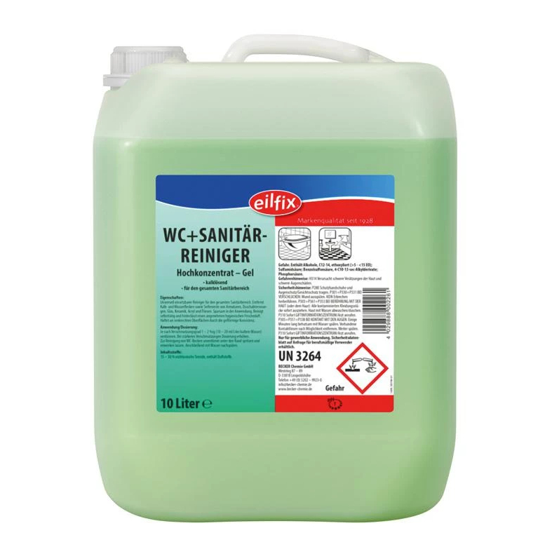 Der Eilfix WC + Sanitärreiniger grün 10 L ist ein hochwirksames Reinigungsmittel, das speziell für den Einsatz in Sanitärbereichen entwickelt wurde. Es eignet sich hervorragend zur Entfernung von Kalkablagerungen, Urinstein, Seifenresten und anderen Verschmutzungen in Toiletten, Bädern und sanitären Einrichtungen. Dank seiner sauren Formulierung löst es hartnäckige Verunreinigungen effizient auf, ohne die Oberflächen zu beschädigen.