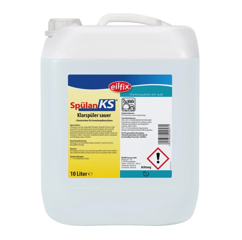 Eilfix Spülan KS Klarspüler Sauer im 10-Liter-Gebinde ist ein hochkonzentrierter Klarspüler und Glanztrockner für alle Typen von Geschirrspülmaschinen. Bereits bei geringen Dosiermengen (0,5 – 0,9 g/L Waschflotte) erzielt Spülan KS perfekte Klarspülergebnisse. Er sorgt für einen ökonomischen Einsatz und gewährleistet einen perfekten Glanz, auch bei unterschiedlichstem Spülgut.