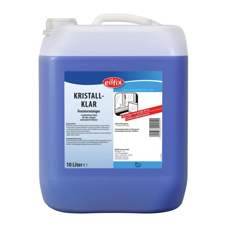Kristall-Klar flüssig 10 L ist ein gebrauchsfertiger Glas- und Oberflächenreiniger, der speziell für den professionellen Einsatz in Haushalten, Büros und Gewerbebetrieben entwickelt wurde. Das Produkt eignet sich hervorragend zur Reinigung von Fenstern, Spiegeln, Glasflächen, Kunststoffen und anderen glatten Oberflächen. Es entfernt zuverlässig Schmutz, Fett, Fingerabdrücke und andere Verschmutzungen, ohne Rückstände zu hinterlassen.