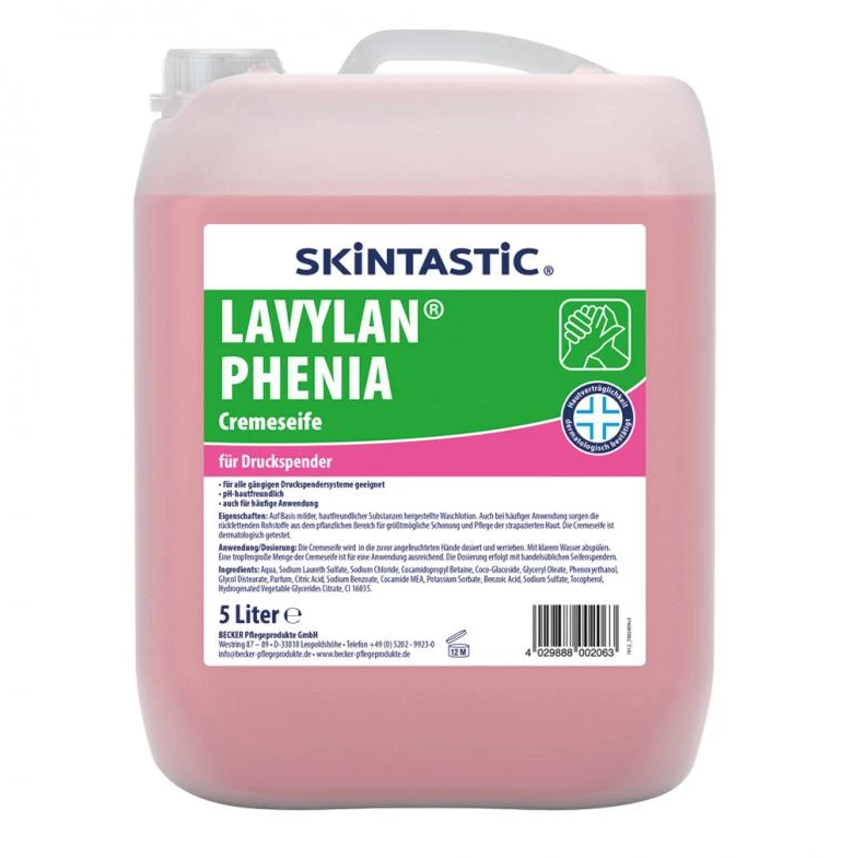 Eilfix Skintastic Lavylan Phenia Cremeseife für Druckspender (VE 1 x 5 L) ist eine milde Waschlotion auf pflanzlicher Basis, die die Haut bei häufiger Anwendung pflegt und schützt. Mit rückfettenden Rohstoffen aus pflanzlichen Inhaltsstoffen sorgt sie für sanfte Reinigung ohne Hautreizungen. Dermatologisch getestet. Die Seife wird mit handelsüblichen Seifenspendern dosiert, eine kleine Menge genügt für eine Anwendung.