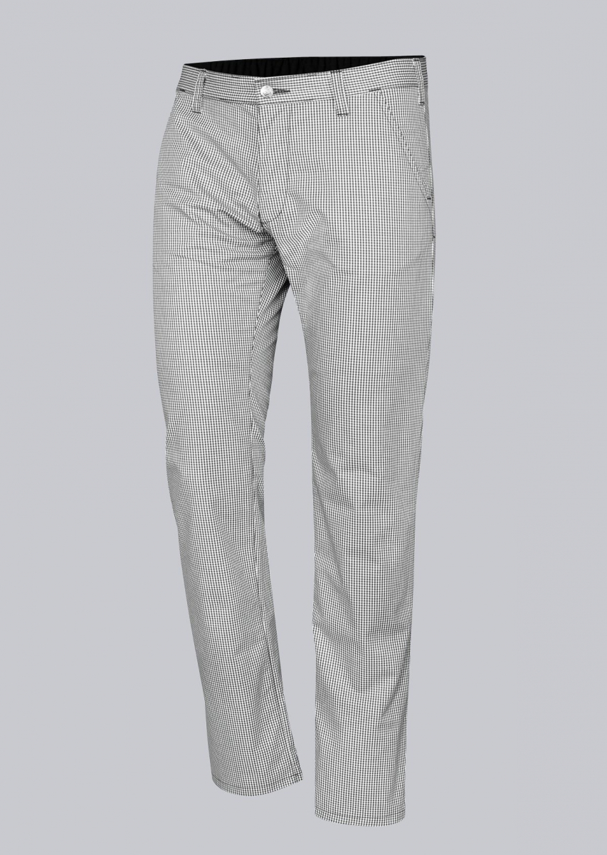 Die geräumigen Eingriffstaschen bieten ausreichend Platz für Arbeitsmaterialien, während die zwei Gesäßtaschen zusätzlichen Stauraum schaffen. Das elegante schwarz-weiße Pepita-Muster verleiht der Hose einen zeitlosen Look, der sich perfekt in verschiedene Arbeitsumgebungen einfügt.