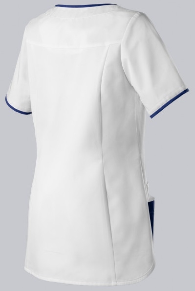 Dank des modernen Schnitts und der stilvollen Farbkombination weiß/nachtblau strahlen Sie Professionalität und Eleganz aus. Die Seitenschlitze gewährleisten Bewegungsfreiheit, ideal für alle Tätigkeiten in Krankenhaus, Praxis oder Pflegeeinrichtung.