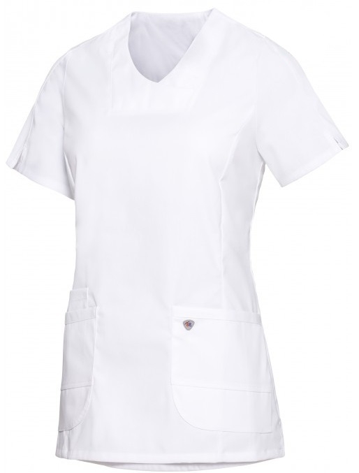 Der moderne, blicksichere V-Ausschnitt verleiht dem Kasack eine professionelle Note, während die geräumigen Seitentaschen praktischen Stauraum bieten. Eine der Taschen ist mit einer praktischen Schlüsselschlaufe ausgestattet, die andere verfügt über eine spezielle Piepertasche für medizinische Geräte. Die Seitenschlitze gewährleisten zusätzliche Bewegungsfreiheit.