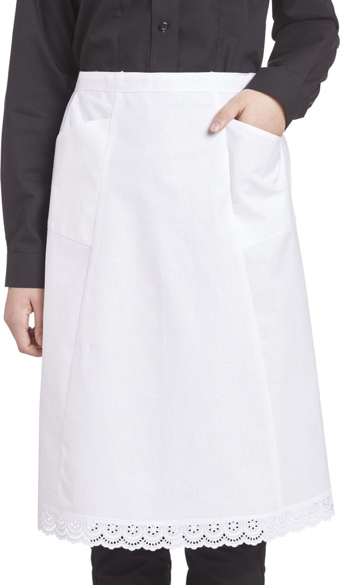 Entdecken Sie unsere elegante Halbschürze - der perfekte Begleiter für Ihre Küche und darüber hinaus! Diese lange, dreiteilige Schürze besticht durch ihre hochwertige Verarbeitung und den stilvollen Cambricspitzenabschluss. Mit einer Länge von ca. 64 cm bietet sie optimalen Schutz für Ihre Kleidung beim Kochen, Backen oder Servieren.