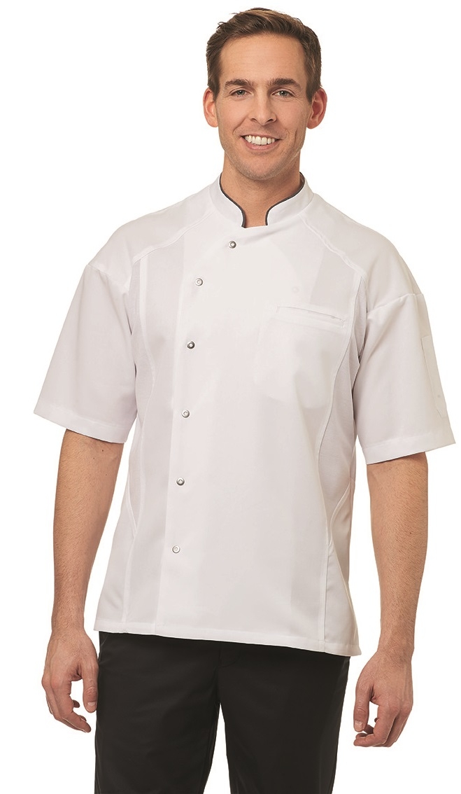 Erhältlich in klassischem Weiß oder elegantem Schwarz, passt sich diese Kochjacke jedem Küchenambiente an. Das pflegeleichte Material macht die Reinigung zum Kinderspiel - sogar für die Industriewäsche geeignet!