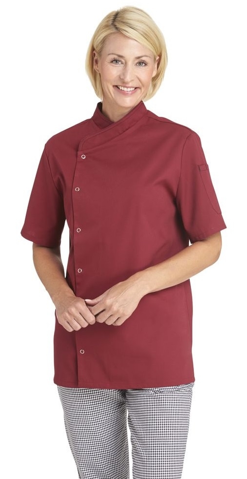 Die Jacke verfügt über praktische Details wie eine Druckknopfleiste für schnelles An- und Ausziehen, eine Kontraststeppung am Kragen für einen stylischen Look und eine Ärmeltasche für wichtige Utensilien. Erhältlich in den Farben Weiß, Schwarz und Bordeaux, passt sie sich jedem Küchenambiente an.
