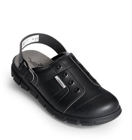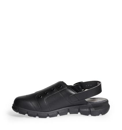 Das schwarze Mikrofaser-Obermaterial bietet nicht nur ein professionelles Erscheinungsbild, sondern ist auch besonders pflegeleicht und langlebig. Der feststehende, verstellbare Fersenriemen sorgt für einen sicheren Halt und optimale Passform während des gesamten Arbeitstages.