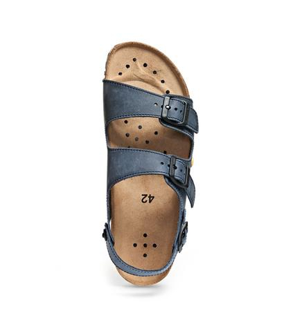 Das blaue Veloursleder verleiht der Sandale eine elegante Optik, während der feststehende, verstellbare Fersenriemen und die zwei verstellbaren Ristriemen für optimalen Halt sorgen. Der Schnallenverschluss ermöglicht ein einfaches An- und Ausziehen.